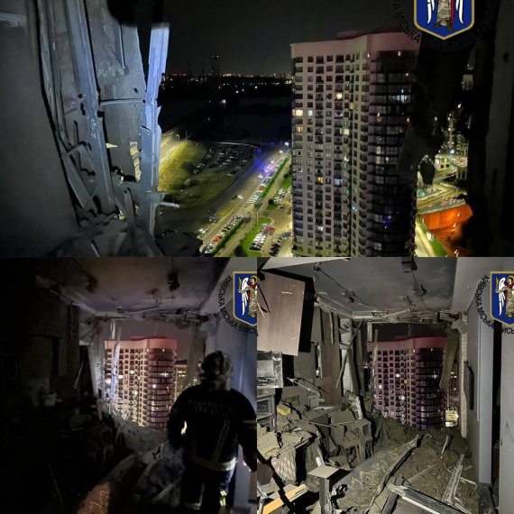 Уламки збитого дрона влучили у 25-й поверх будівлі у Дарницькому районі столиці, повідомив журналіст Ян Доброносов.