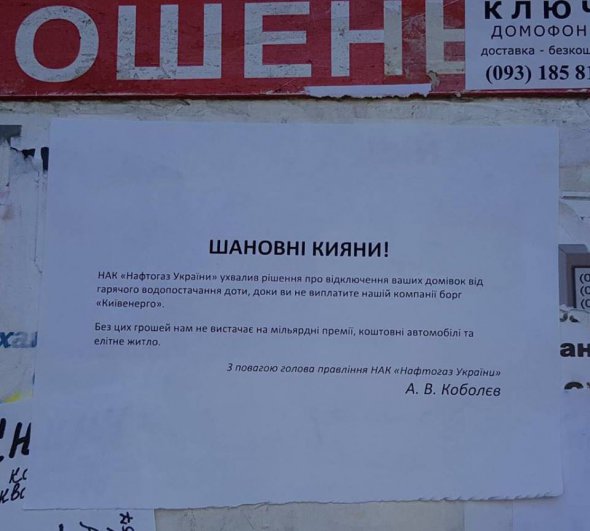 "Нафтогаз" України ухвалив рішення про відключення гарячої води ваших домівок від гарячого водопостачання доти, доки ви не виплатите борг нашій компанії Київенерго. Без цих грошей нам вистачить коштів на мільярдні премії, дорогі автомобілі та іншу розкіш для співробітників компанії. З повагою, голова правління НАК "Нафтогаз України" А. В. Коболєв", — йдеться в тексті оголошення.