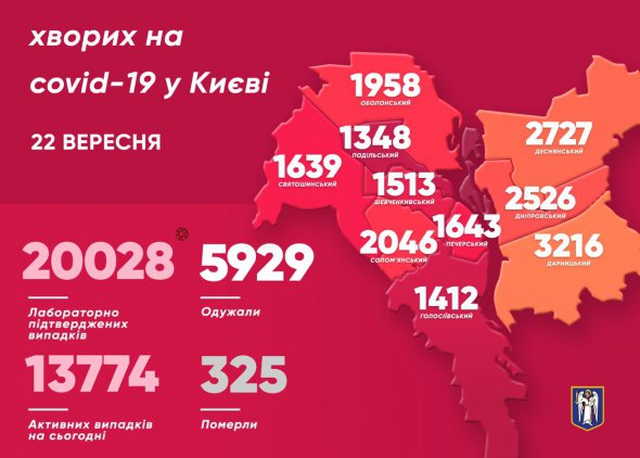Станом на 22 вересня, інфікованих коронавірусом у Києві побільшало на 270. Загалом підтверджених випадків захворювання вже 20 028.
