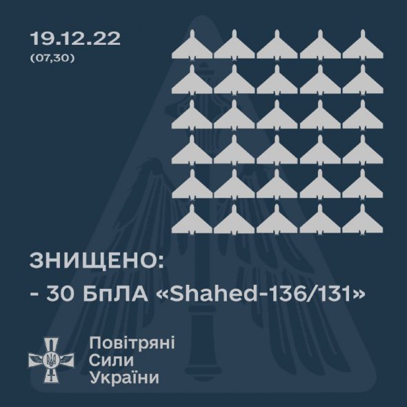 У ніч на 19 грудня сили протиповітряної оборони України збили 30 з 35 іранських ударних дронів типу Shahed.