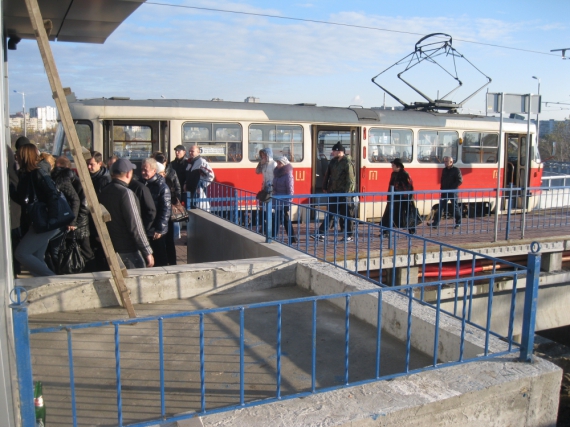 "Казали, що трамвай ходитиме в нікуди, насправді він підвозить зранку сюди кілька тисяч чоловік. Через це дуже багато людей і неможливо зайти в електричку. Особливо з 7-ї до 8-ї ранку, і в той же час тільки ввечері. Якраз офіси закрили і всі менеджери їдуть на Троєщину. Поки в трамваї їздити можна безкоштовно. Потім обіцяють, що і електричка буде за ті ж самі гроші. В трамваї купив квиток за дві гривні, закомпостував, а тут на платформі компостуєш з другого боку. Вчора так вийшло, що жінка поїхала, а я стояв, як ідіот, на платформі", — обіймає дружину Віктор Вассер, 28 років.