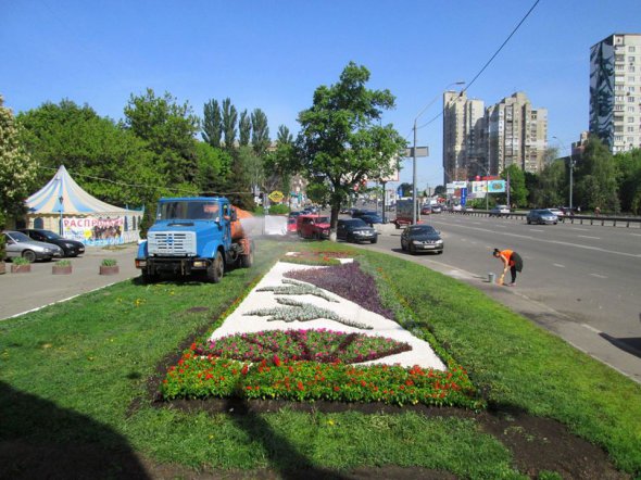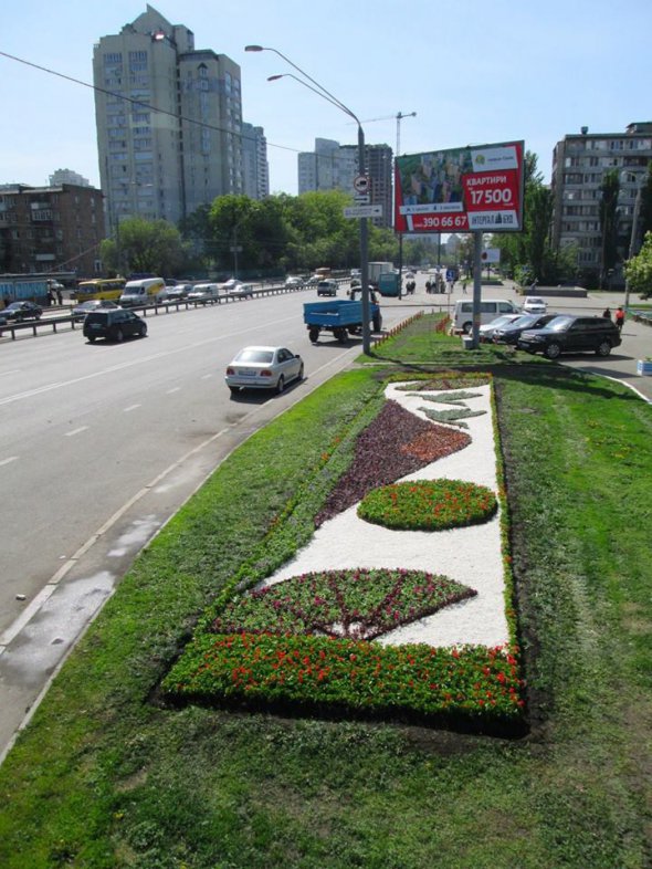 Озеленювачі КП УЗН Святошинського району Києва до року Японії в Україні висадили тематичний квітник на просп. Перемоги.