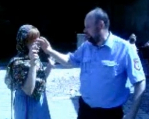 - Снова снимаешь, наглая, да? - до кіоску підходить продавчиня і починає кудись телефонувати. Прибігають двоє чоловіків у формі охоронців із шевронами "Громадська організація "Козацтво Запорозьке".
