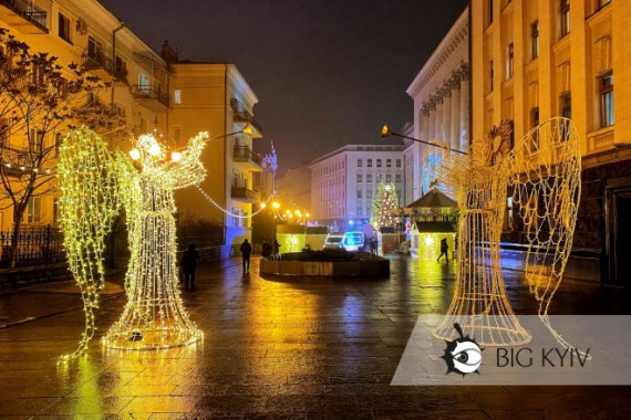 Уже з'явилися сяючі янголи та безліч ялинок з вогниками у вікнах будівлі та біля неї. Раніше тут змонтували та залили ковзанку, встановили живу ялинку, фотозони та карусель, пише Big Kyiv.