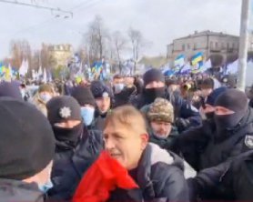 На кадрах видно, як Балух тримав автомобільну шину. Силовики її відібрали. Після цього Балух вирвав з рук поліцейського шолом та жбурнув його.