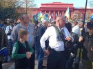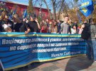 Зібралися представники Всеукраїнського об'єднання "Свобода", Нацкорпусу, "Соколу" та інших патріотичних організацій. Тримають державні, партійні прапори, червоно-чорні стяги.