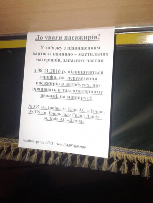 "У зв'язку з підвищенням вартості паливно-мастильних матеріалів, запасних частин з 8 листопада підвищуються тарифи на перевезення пасажирів в автобусах, які працюють в таксомоторному режимі на маршрутах: №392 (Ірпінь - Київ, АС" Дачна ") і № 379 (Ірпінь ( ж / к "Гранд Лайф") - Київ, АС "Дачна", - йдеться в оголошенні.