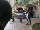 На подвір'ї офісу стались сутички. Поліцейських закидали димовими шашками і картоплею, облили червоною фарбою.