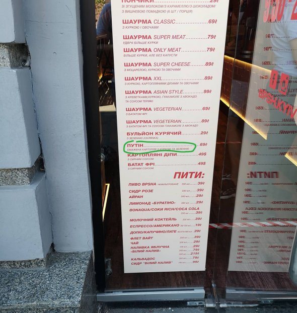 У ресторані "Біляш. Пончик. Шаурма" пропонують відвідувачам страву, яка має співзвучну назву з прізвищем російського президента – "Путін".