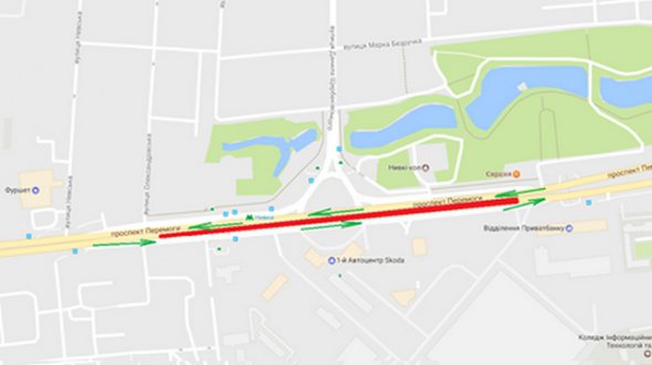 Тут ремонтують транспортний вузол. Обмежать рух на шляхопроводі біля станції метро Нивки в напрямку центру міста. Транспорт пускатимуть по низовій частині просп. Перемоги.