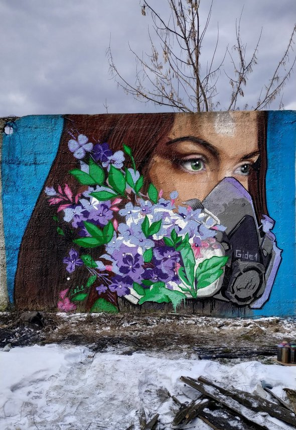 Столичний художник Віталій Гідеван створив новий мурал – дівчина в респіраторі, прикрашеному квітами. Малюнок з'явився в Софійській Борщагівці.