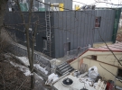 У понеділок в обід центральний фасад будівлі затягнутий зеленим будівельним полотном. З території вантажівками вивозять будівельне сміття. На даху тривають зварювальні роботи.