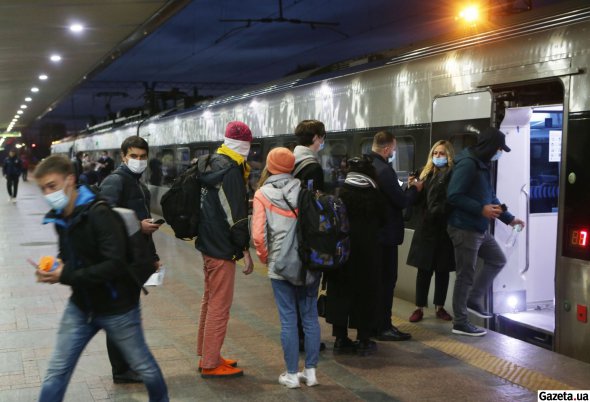 О 10:00 на посадку подають потяг "Київ-Шостка". Провідники розмовляти не хочуть. Але зізнаються, що у середньому в кожному вагоні буде по 10 людей. Попередньо всі місця були забиті, але люди повернули квитки після нововведень.