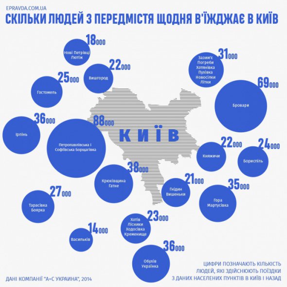 Під час вивчення мобільності Києва за підтримки Світового банку в 2014 році експерти підрахували, що загалом до столиці з передмість в'їжджає близько 500 тисяч осіб. Зараз ця цифра може становити близько 700 тисяч, вважає директор "А+С Україна" Дмитро Беспалов.