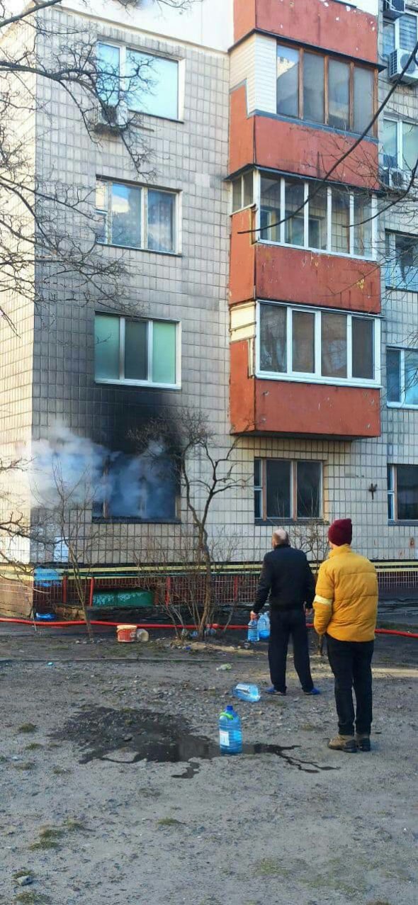 У київський будинок на просп. Шухевича, 24, потрапив снаряд. Поки невідомо, чи є постраждалі.