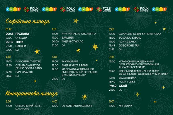 Так, 4 січня на Софійській площі з 17:00 виступатиме Kyiv Opera Theatre, о 18:30 на сцену вийдуть скрипаль-віртуоз Денис Боєв & band, о 19:30 – гурт "Круасан". Завершиться програма виступами діджеїв, початок о 20:30.