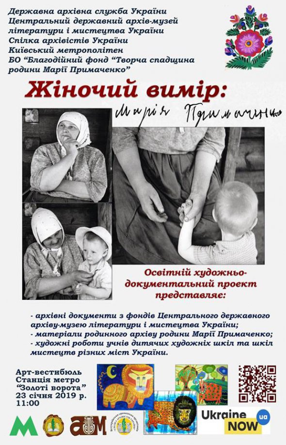 У вестибюлі станції метро Золоті ворота 23 січня об 11:00 у супроводі живої музики відкриють художньо-документальну виставку до 110-річчя української художниці Марії Примаченко та Дня соборності України. Вона носитиме назву "Жіночий вимір: Марія Примаченко".