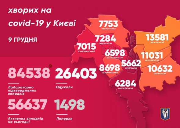 Станом на 9 грудня інфікованих коронавірусом у столиці побільшало на 1728. Учора недугу діагностували в 1475 людей. Загалом підтверджених випадків - 84 538.