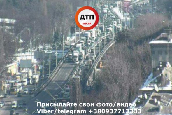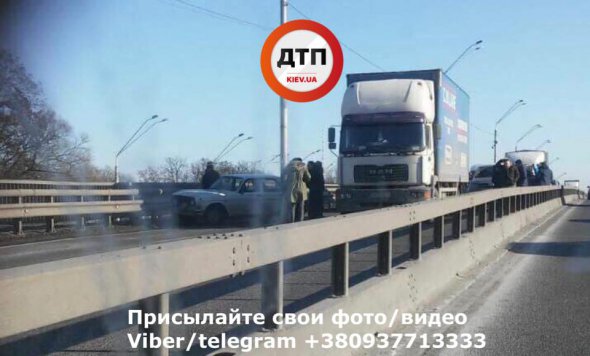 "На шляхопроводі зіткнулися два автомобілі: ГАЗ та MAN. Рух з центру у напрямку Житомирської ускладнено, проїзд дуже вузький, утворився величезний затор", - йдеться в повідомленні.