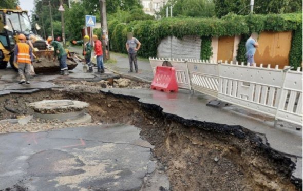 Після руйнівної зливи в Києві на низці вулиць провалився асфальт. Туди викликали працівників шляхового-експлуатаційного управління району.
