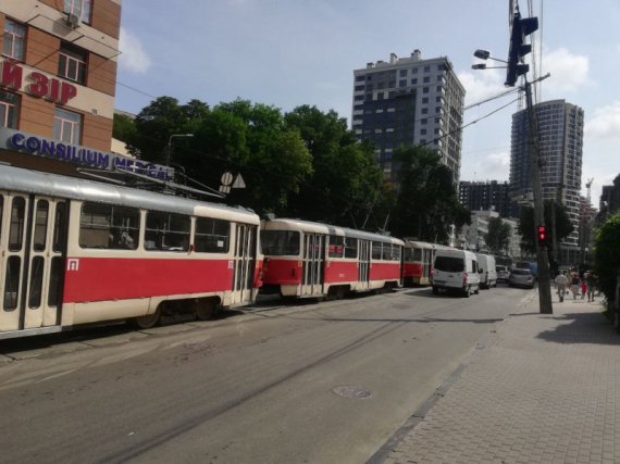 Затор із трамваїв утворився між зупинками "Сквер Гейдара Алієва" й "Кудрявський узвіз". Через це ускладнений трафік у напрямку від Повітрофлотського мосту.