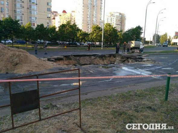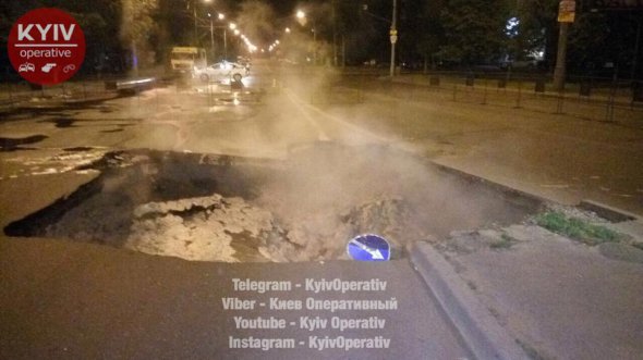 "НП на проспекті Героїв Сталінграда! Провалився асфальт, бо прорвало тепломережу. Не менше 25 будинків залишилися без води. Дорогу повністю перекрили в обидва боки. Трубам понад 35 років, хоча за регламентом їх мали змінити років 10 тому. Працюють служби", - йдеться у повідомленні.