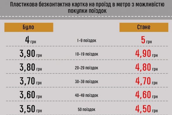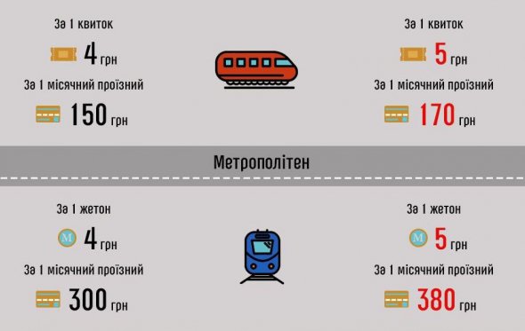 Заступник голови КМДА з питань цінової політики Василь Яструбинський раніше пояснював, що економічно обґрунтовані тарифи ще вищі: 6,64 грн - поїздка в метро, а у наземному транспорті - 6,91 грн.