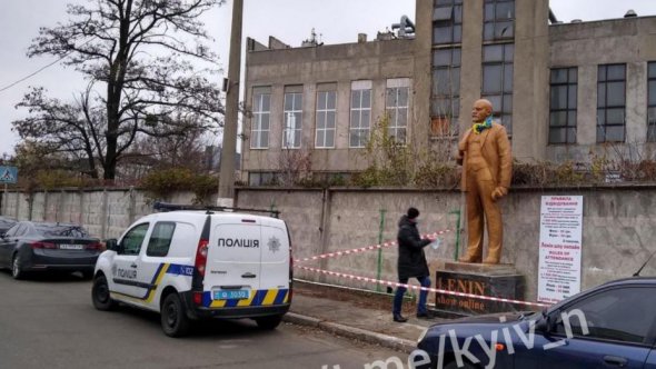 Постамент встановили на базі з написом "Ленін шоу-онлайн", а на шию радянського лідера зав'язали жовто-блакитний прапор.