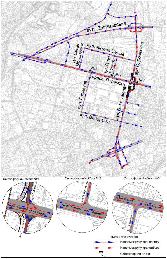 Рух вулицею Олександра Довженка і Вадима Гетьмана у бік Караваєвих Дач відбуватиметься вулицями Антона Цедика (Ежена Потьє), Петра Нестерова із виїздом на проспект Перемоги, по Гарматній, Виборзькій та повернення на вул. Вадима Гетьмана. У бік вул. Олени Теліги буде збережено виїзд на проспект Перемоги із можливістю прямого перетину проспекту з виїздом на вул. Олександра Довженка.