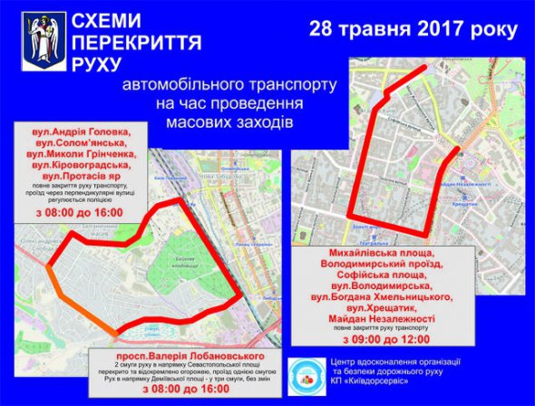 Цього ж дня 9 години ранку до 12 години дня рух транспорту перекриють під час проведення 25-го відкритого легкоатлетичного благодійного "Пробігу під каштанами" за маршрутом: Михайлівська площа - Володимирський проїзд - Софійська площа - вул. Володимирська - вул. Богдана Хмельницького - вул. Хрещатик - Майдан Незалежності.