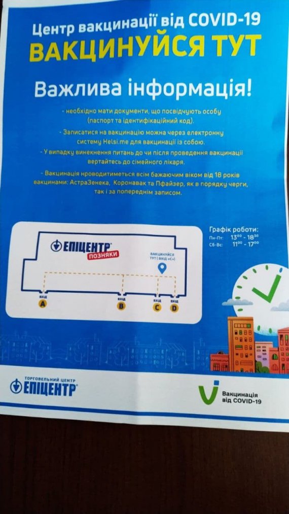 У вихідні пункт вакцинації в "Епіцентрі" працюватиме з 11:00 до 17:00. У будні дні з 13:00 до 18:30. Із собою необхідно мати паспорт та ідентифікаційний код.
