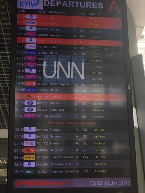 В аеропорту "Київ" затримують рейси до Анталії та Ербіля. Виліт до Стокгольма, який мав здійснити авіаперевізник Bravo Airways, скасували.