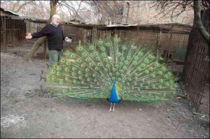 Павич Павлуша живе у дворі будинку за п’ять хвилин ходи від метро Лук’янівка в Києві, у господарстві інженера Юрія Руголя