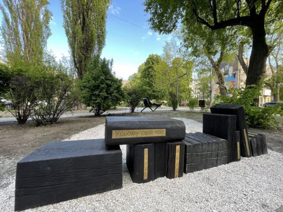 У київському Сквері інтелігентів, на вулиці Олеся Гончара, 9, установили артінсталяцію у формі лави під назвою "Усьому свій час".