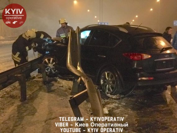 На Житомирській трасі в Києві, в сторону виїзду зі столиці, водій на Infiniti різко загальмував на світлофорі, на слизькій дорозі посунувся далі і напоровся на відбійник.