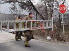 Згодом дерево опустилося на висоту близько 4 метрів, а єнот стрибнув на м'яку землю. Зусиллями рятувальників та пожежників його зловили й помістили в переноску.