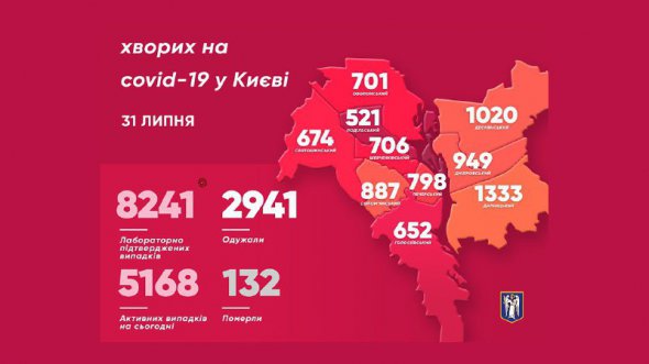 Станом на 31 липня кількість хворих на коронавірус у Києві збільшилася на 110 інфікованих. На сьогодні в столиці вже підтвердили 8241 випадок захворювання на Covid-19.