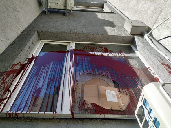 "Невідомі близько другої години ночі залили фарбою вікно офісу та закинули всередину приміщення молоток. Він розбив вікно", - пишуть в прес-центрі.