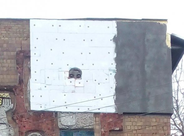 Мешканці будинку вирішили зробити зовнішнє утеплення квартири у дивний спосіб. Один із зображених на стіні чоловіків практично повністю опинився заклеєний пінопластом. Залишили йому тільки очі.