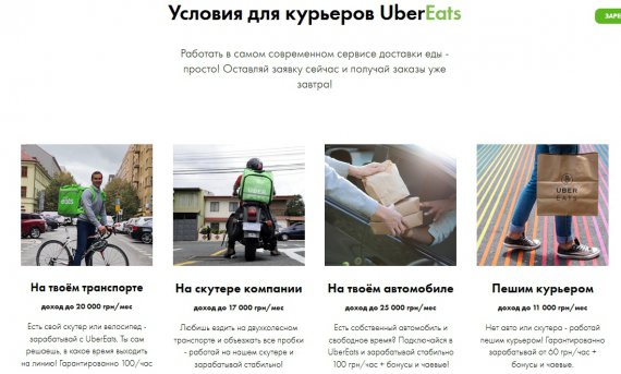 Крім того, на сайті компанії оголосили набір кур'єрів. Доставляти їжу можна на скутері компанії,на власному авто чи велосипеді, також є можливість робити це пішки. При цьому на сайті партнера Uberdrive вказані всі умови співпраці, аж до зарплати і періодичності виплат.