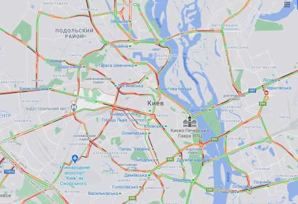 Ускладнений рух фіксують на просп. Перемоги, Валерія Лобановського, Повітрофлотському, вул. Солом'янська, Генерала Шаповала, Великій Васильківській, Набережно-Рибальській, Сирецькій, Вишгородській, Олени Теліги, бульв. Лесі Українки.
