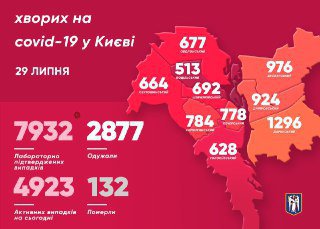 Станом на 29 липня кількість хворих на коронавірус в Києві збільшилася на 132 інфікованих. 2 людини померли, 47 одужали. За весь період коронавірус забрав життя 132 киян, загалом хворобу подолали 2877 мешканців столиці.