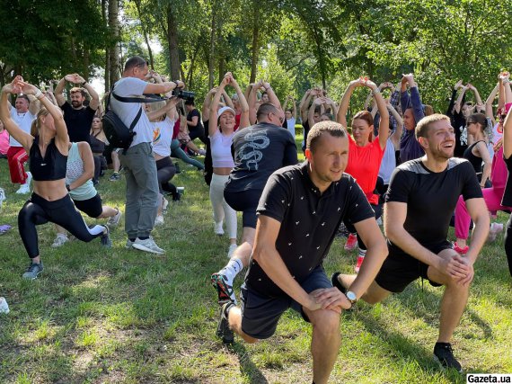 Актори займалися спортом з усіма охочими. Після закінчення тренування люди мали змогу сфотографуватися із артистами та пожертвувати кошти у кошик – гроші підуть на закупівлю "швидких", повідомляє кореспондентка Gazeta.ua.
