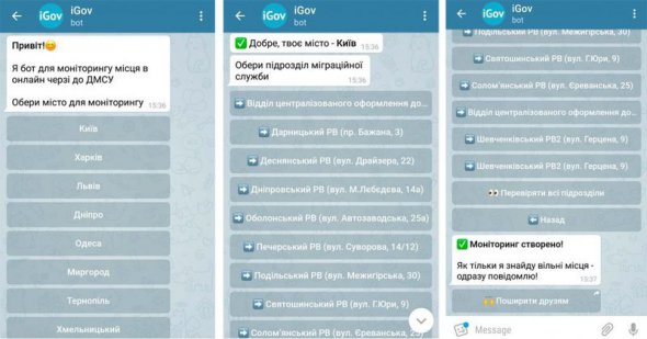 Київський розробник Антон Бібля створив Telegram-бота @igov_bot, який перевіряє наявність вільних місць в онлайн-чергах кожні три хвилини. Поки він працює в восьми містах: Київ, Дніпро, Одеса, Львів, Харків, Миргород, Тернопіль та Хмельницький. Знайшовши вільне місце, він відразу надішле вам повідомлення.