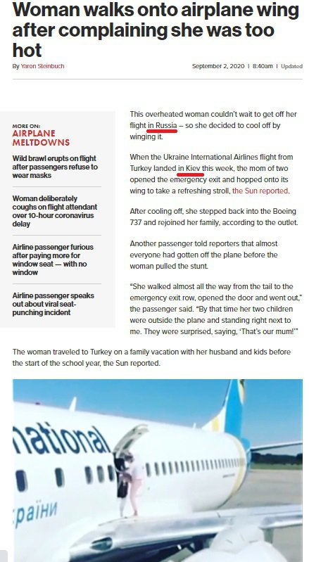 "Цій перегрітій жінці не терпілося зійти з рейсу в Росії", – йдеться у статті, а далі пояснюється, що літак приземлився в Києві.