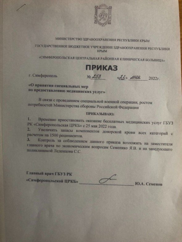 "Головний лікар Сімферопольської ЦРКБ видав спеціальний наказ, що необхідно збільшити запаси крові всіх категорій з розрахунком на 1500 реципієнтів і тимчасово зупинити безплатне надання медичних послуг", - повідомляє Денісова.