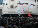 На мітинг із Севастополя прибули автобуси з проросійськими активістами й козаками на чолі з лідером партії "Русское единство" Сергієм Аксьоновим. Із одного боку міліцейського кордону була символіка України і кримських татар, з іншого - російські прапори та георгіївські стрічки. Активістам вдалося скасувати сесію Ради Криму. Але наступного дня парламент півострова підписав рішення про анексію.