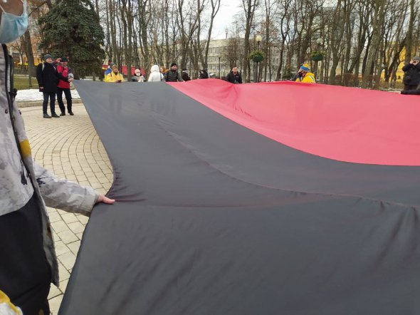 В кінці акції колишній бранець Кремля Ісмаїл Рамазанов розгорнув величезний червоно-чорний прапор.