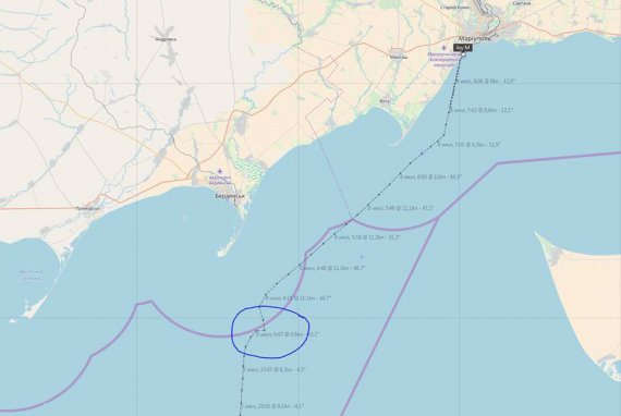 "8 липня з 00:30 до 23:00 катери берегової охорони прикордонної служби ФСБ РФ перехопили 6 суден, що йшли до/з Бердянська або Маріуполя (район перехоплення помічений на карті 1 жовтим маркером). Ще одне судно було перехоплене близько 01:00 в ніч на 09.07.18 в тому ж районі. Список суден надається", - написав Клименко.