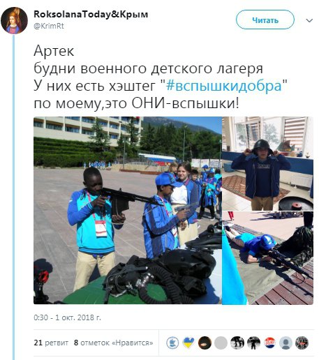 "Артек" - будні військового дитячого табору. У них є хештег #спалахидобра. По-моєму, це вони - спалахи!", - пише блогер.